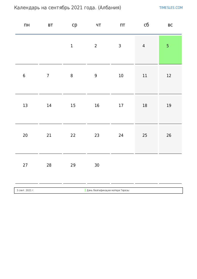 Скачать и распечатать PDF календарь с праздниками и выходными днями на сентябрь 2021 года для Албании