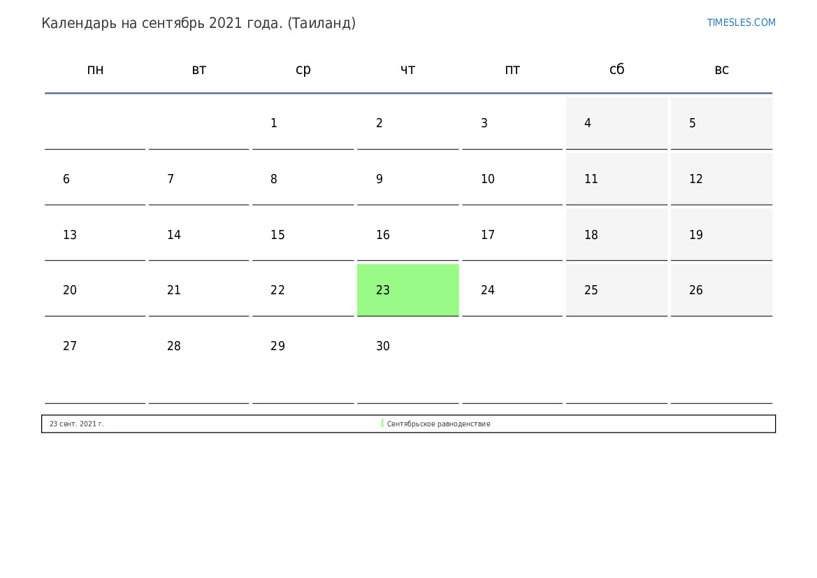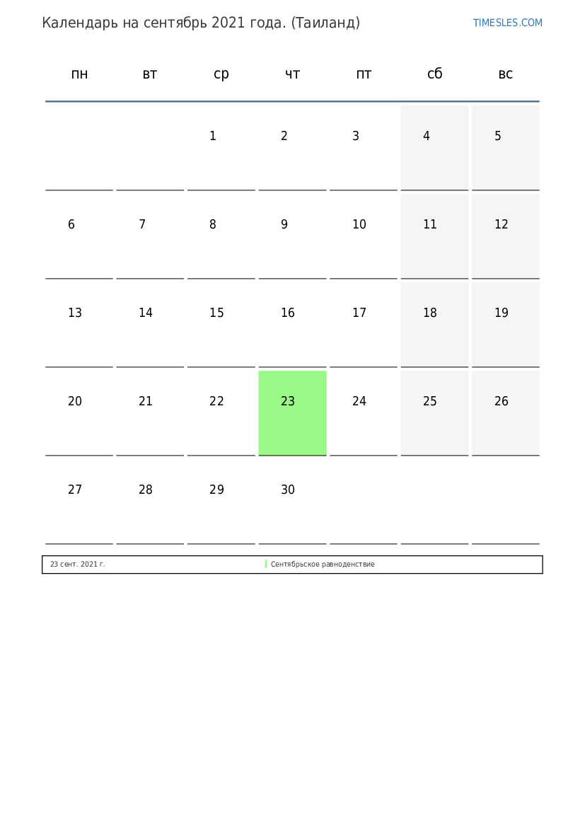 Месяц сентябрь содержит 30 дней. Это 9 месяц 2021 года. Сезон года: осень. Месяц сентябрь начинается в среду, и заканчивается в четверг. В месяц сентябрь 2021 года в Тайланде 1 праздничный и выходной день.
