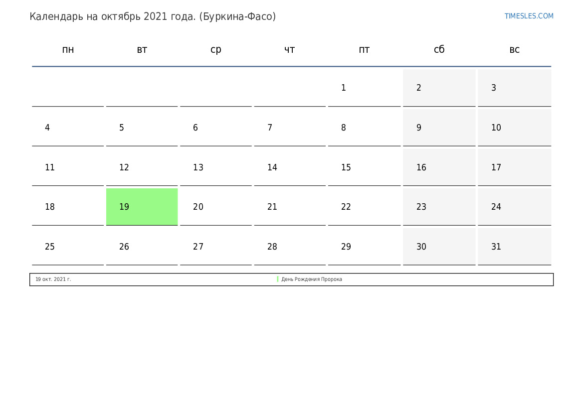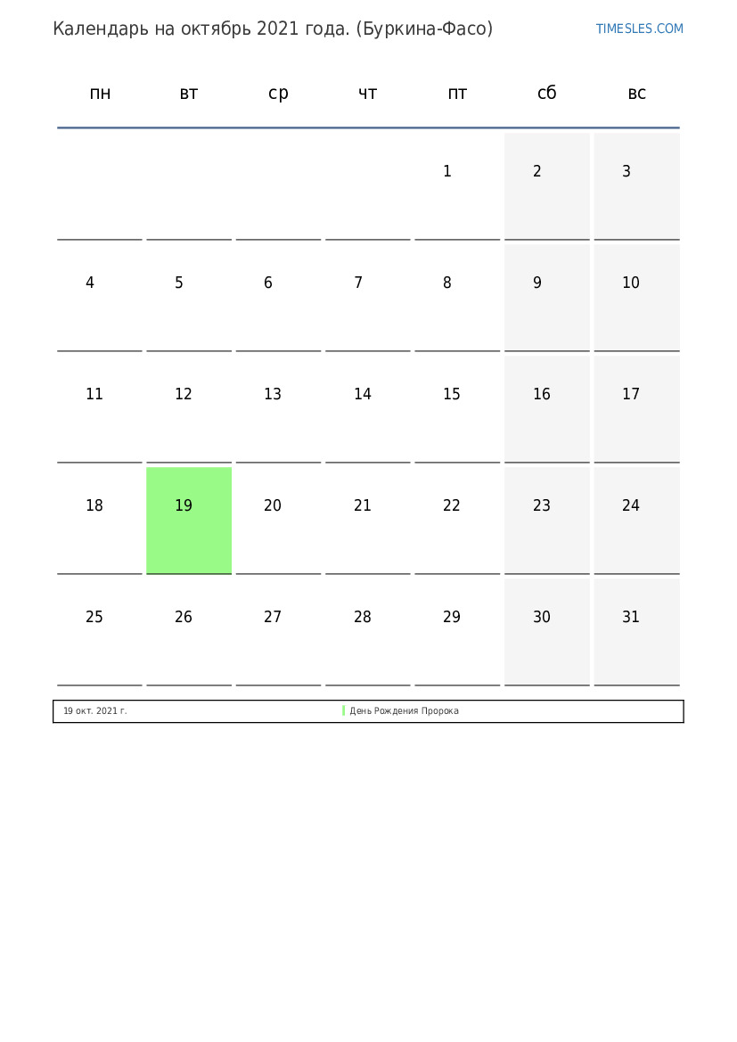Скачать и распечатать PDF календарь с праздниками и выходными днями на октябрь 2021 года для Буркина-Фасо