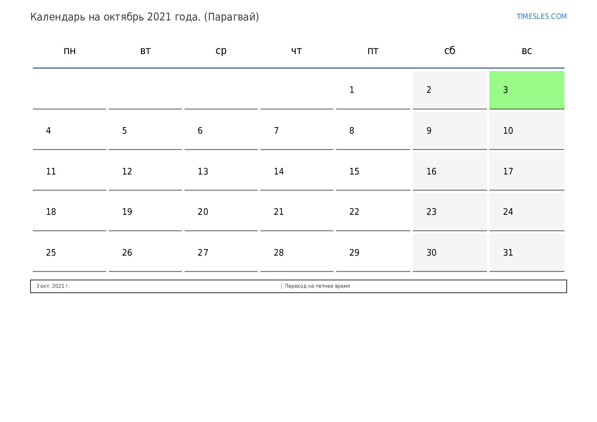 Скачать и распечатать PDF календарь с праздниками и выходными днями на октябрь 2021 года для Парагвая