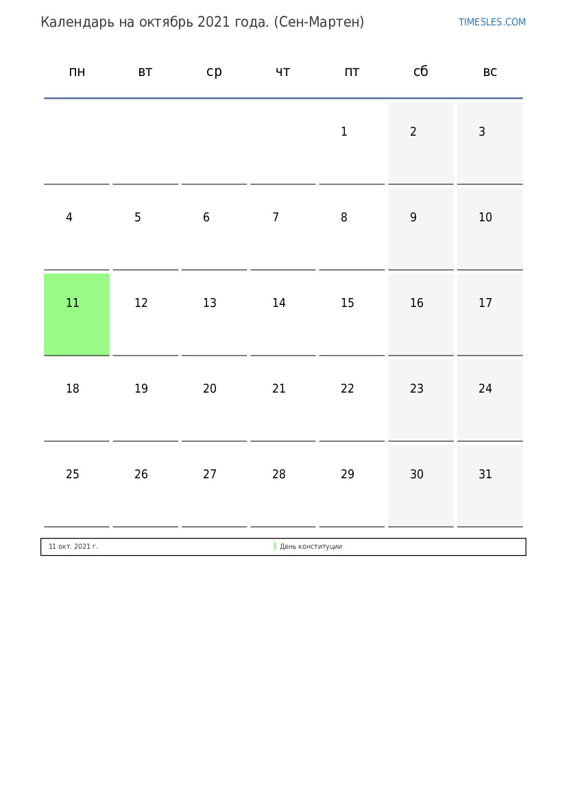 Календарь праздников и выходных дней на октябрь 2021 года для Синт-Мартена