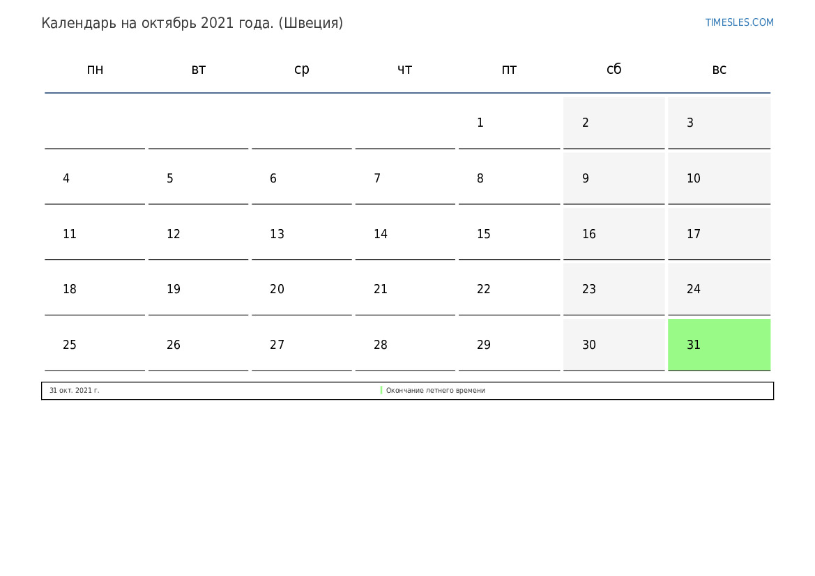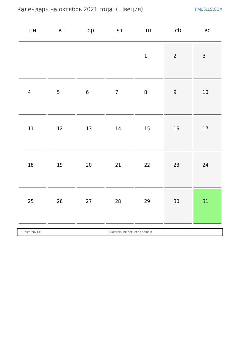Скачать и распечатать PDF календарь с праздниками и выходными днями на октябрь 2021 года для Швеции