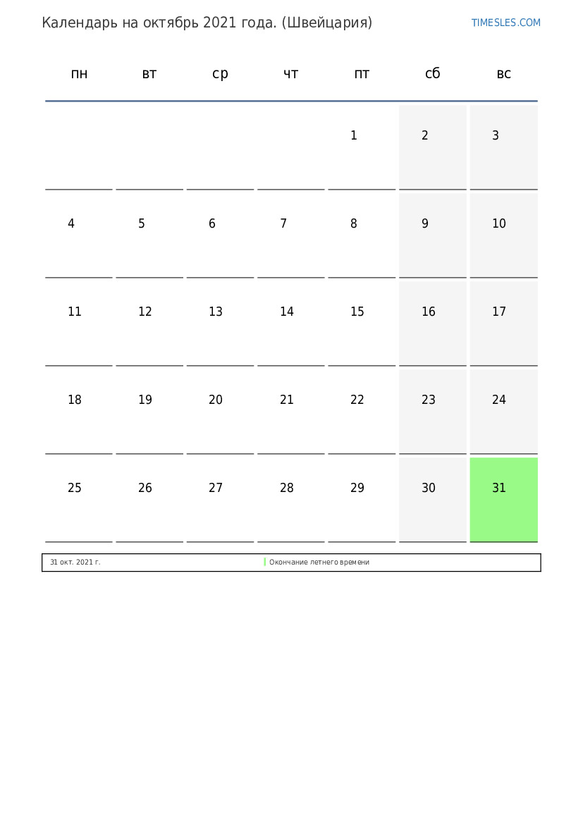 Месяц октябрь содержит 31 день. Это 10 месяц 2021 года. Сезон года: осень. Месяц октябрь начинается в пятницу, и заканчивается в воскресенье. В месяц октябрь 2021 года в Швейцарии 1 праздничный и выходной день.