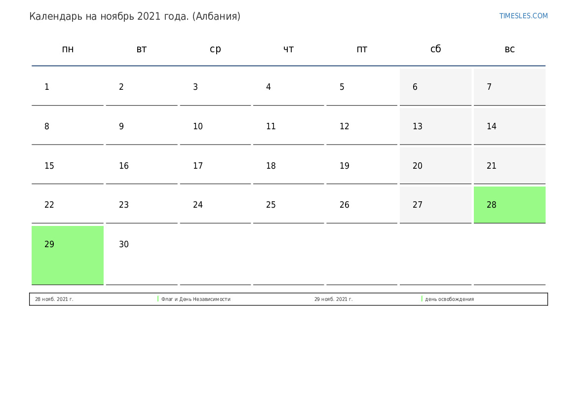 Календарь праздников и выходных дней на ноябрь 2021 года для Албании