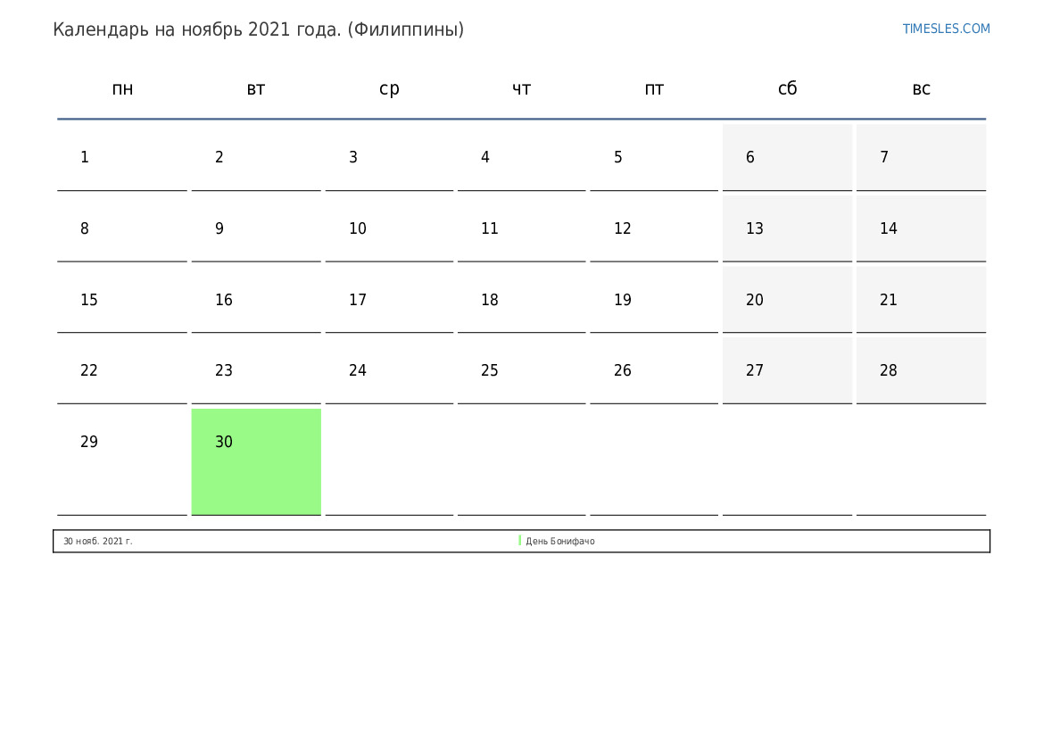Скачать и распечатать PDF календарь с праздниками и выходными днями на ноябрь 2021 года для Филиппин