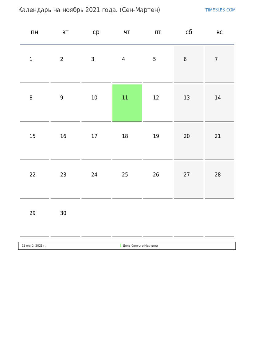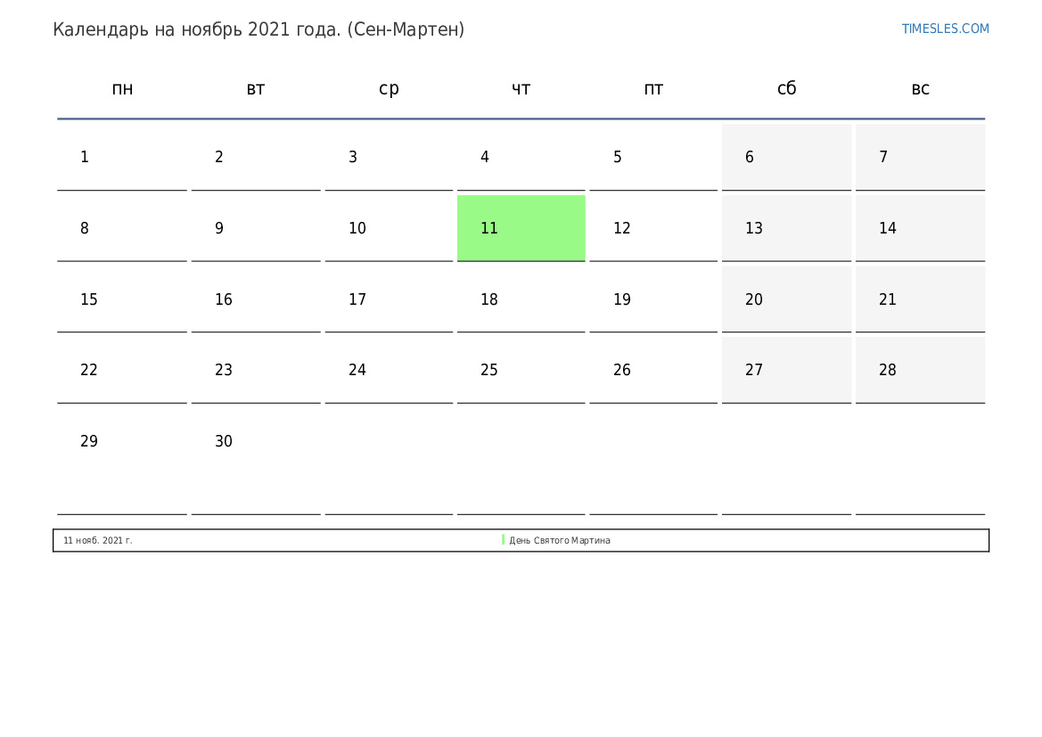 Месяц ноябрь содержит 30 дней. Это 11 месяц 2021 года. Сезон года: осень. Месяц ноябрь начинается в понедельник, и заканчивается во вторник. В месяц ноябрь 2021 года в Синт-Мартене 1 праздничный и выходной день.