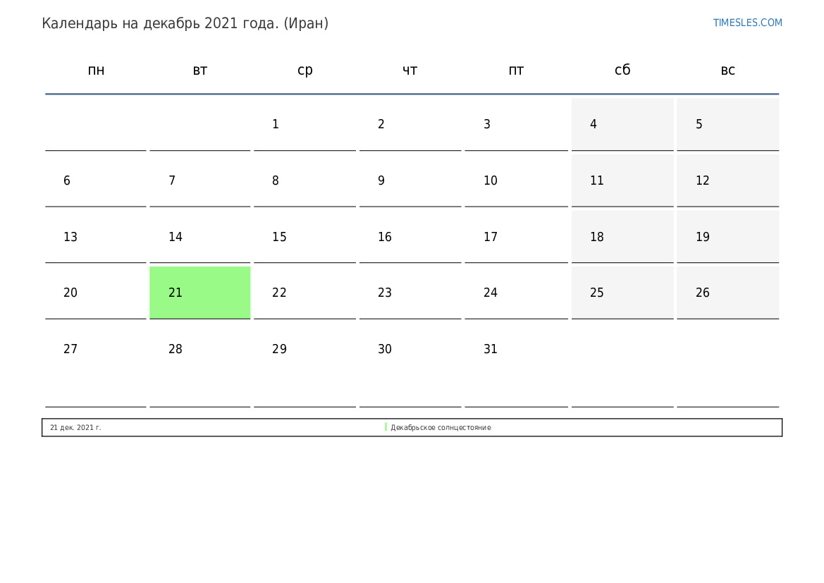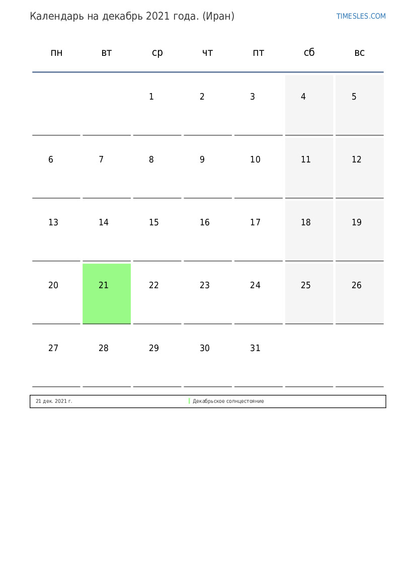 Скачать и распечатать PDF календарь с праздниками и выходными днями на декабрь 2021 года для Ирана