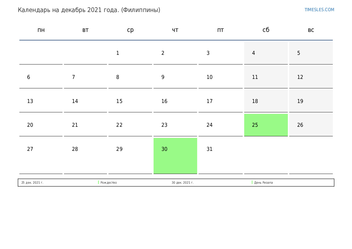Календарь праздников и выходных дней на декабрь 2021 года для Филиппин
