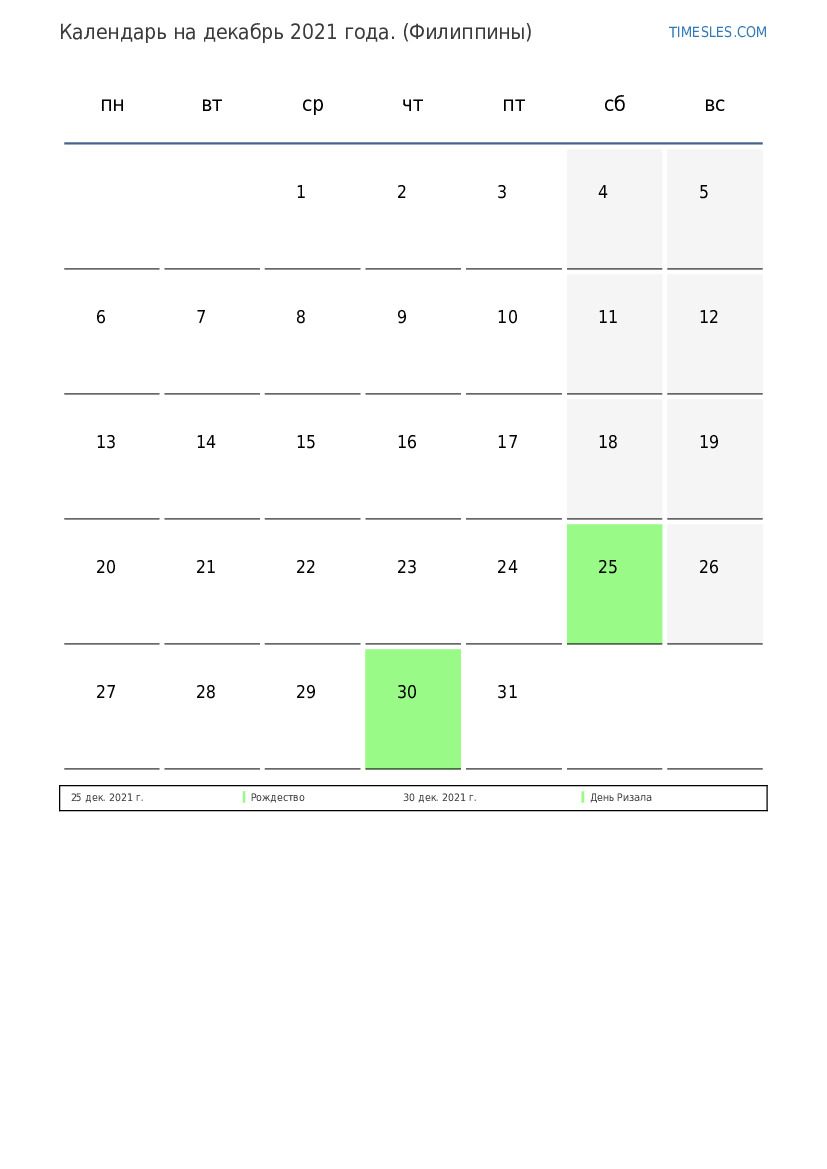 Календарь на декабрь 2021 года для Филиппин