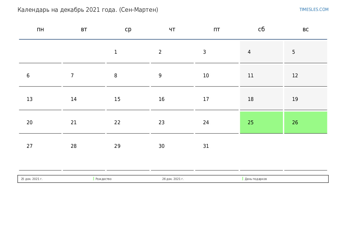 Календарь праздников и выходных дней на декабрь 2021 года для Синт-Мартена