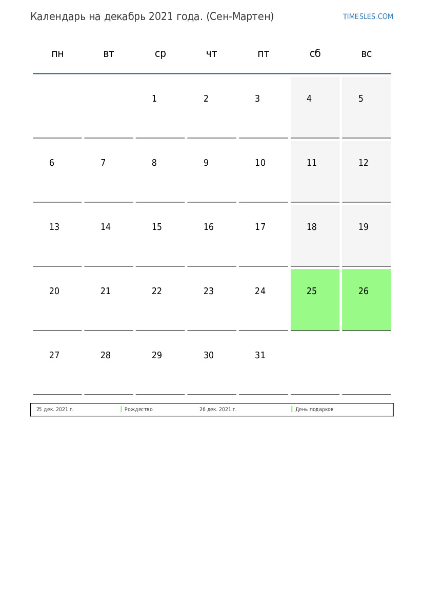 Скачать и распечатать PDF календарь с праздниками и выходными днями на декабрь 2021 года для Синт-Мартена