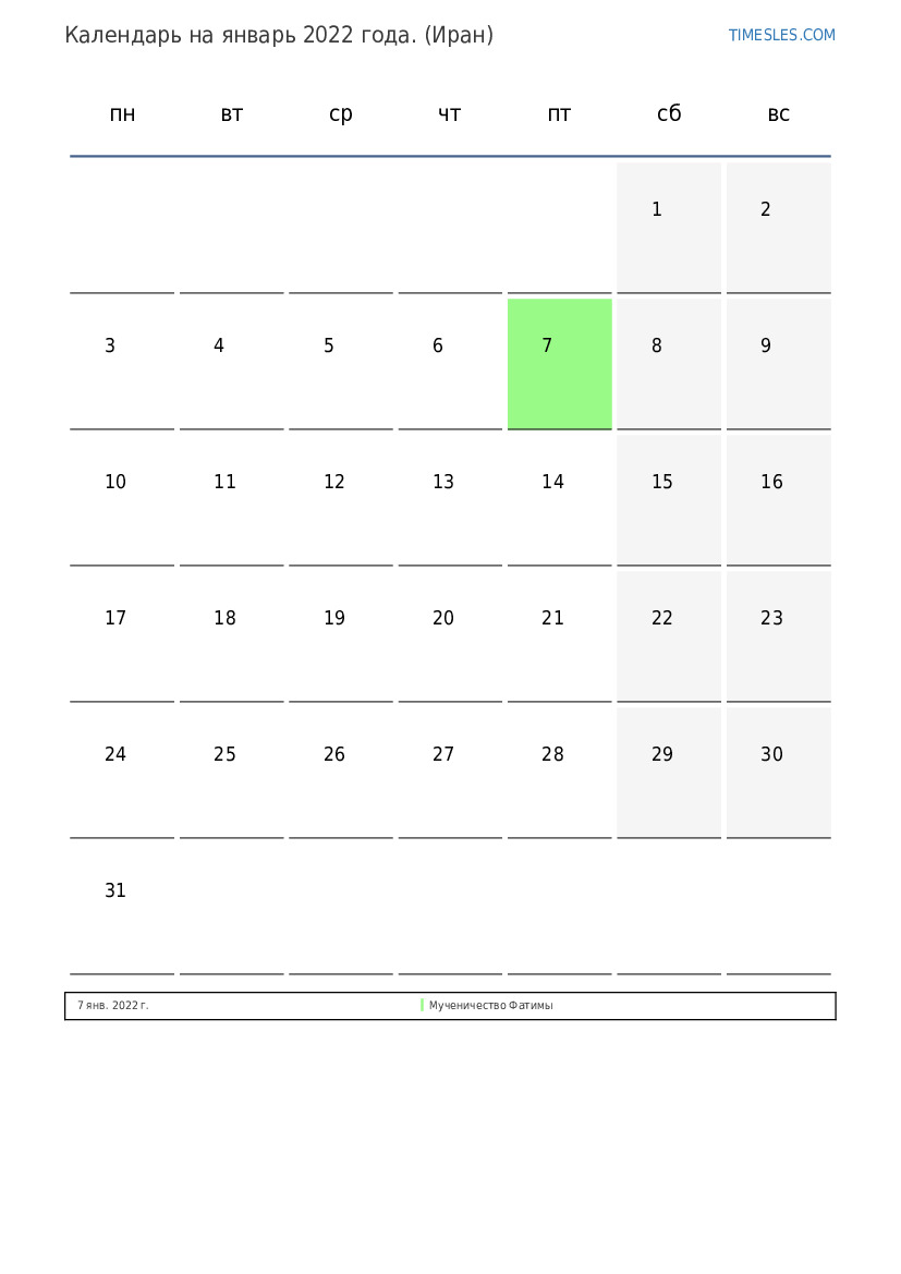 Календарь праздников и выходных дней на январь 2022 года для Ирана