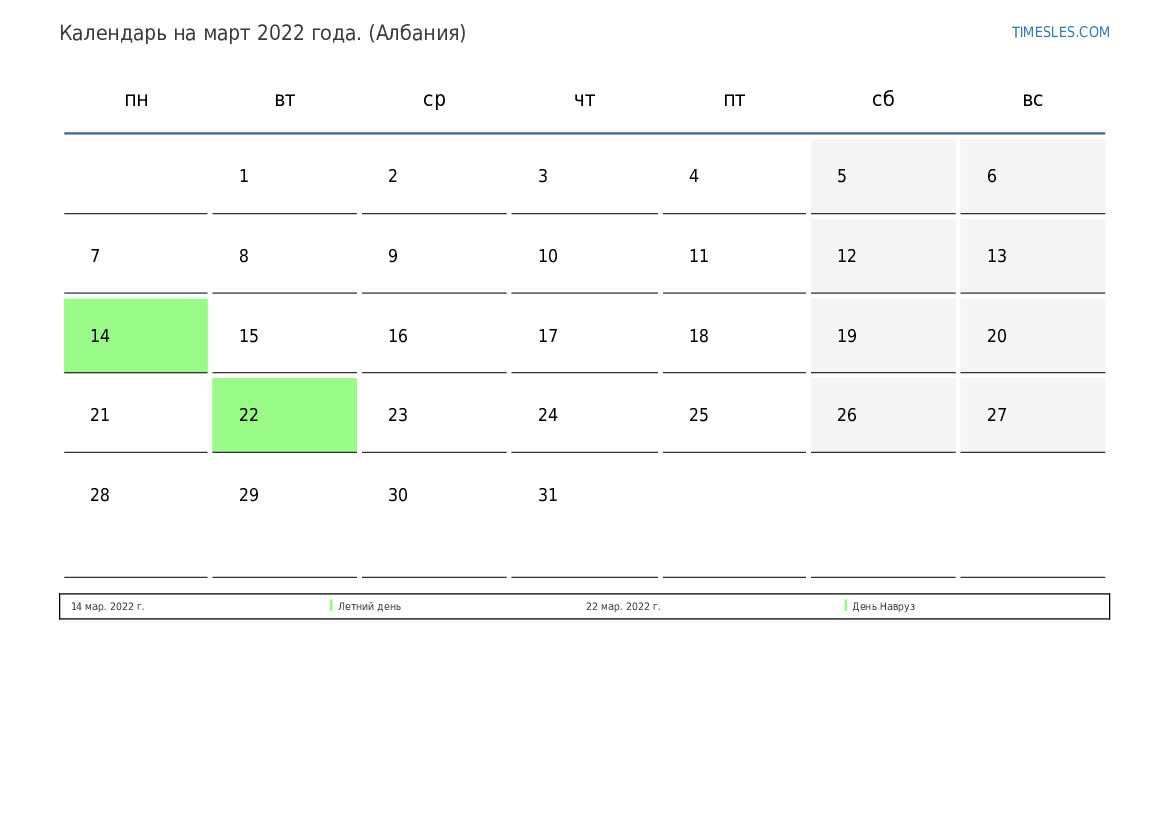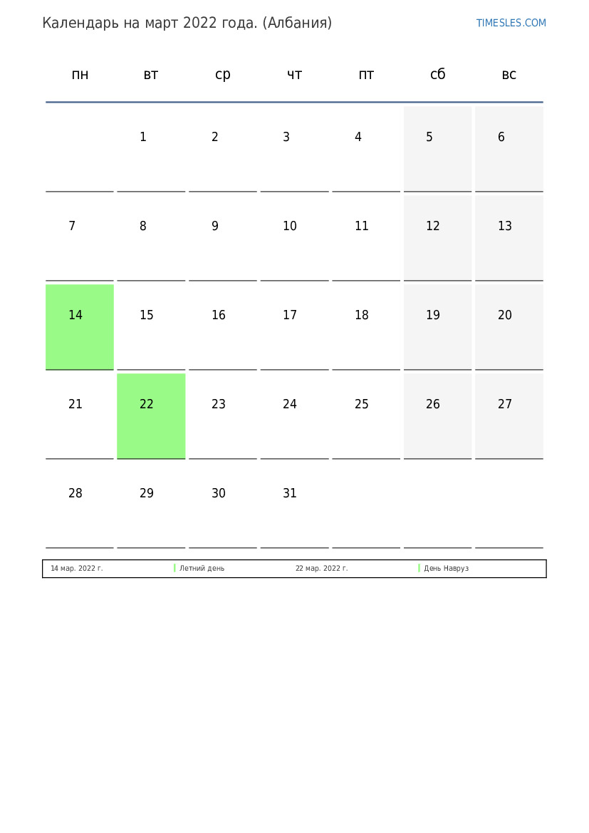 Скачать и распечатать PDF календарь с праздниками и выходными днями на март 2022 года для Албании
