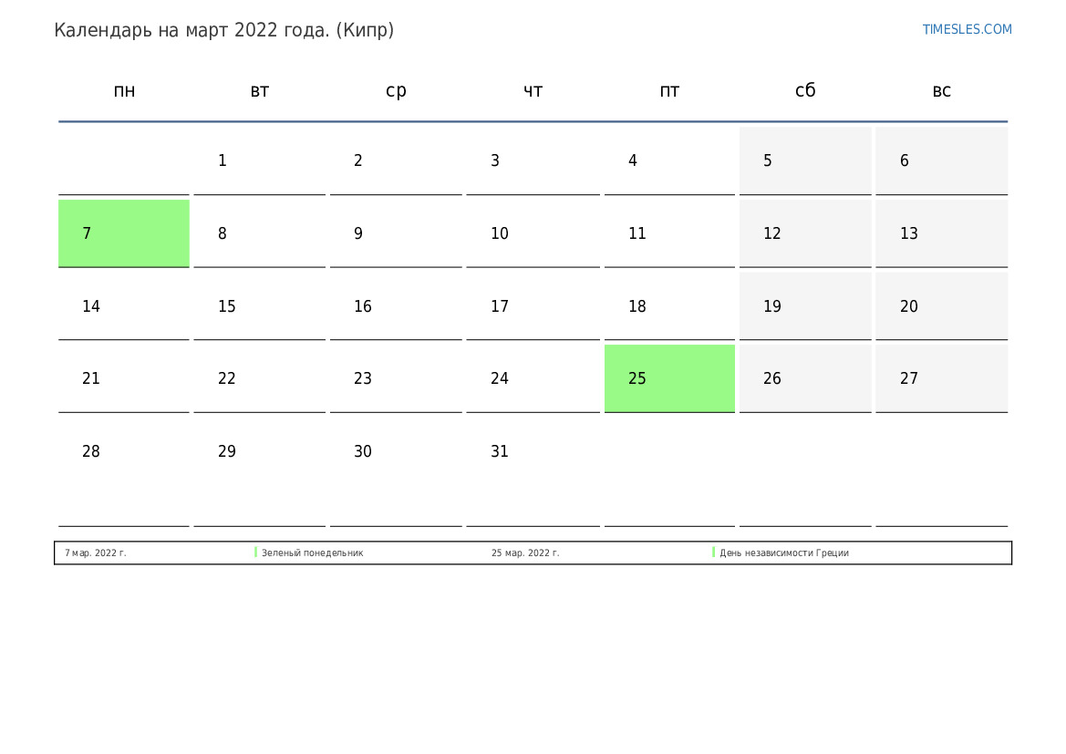 Скачать и распечатать PDF календарь с праздниками и выходными днями на март 2022 года для Кипра