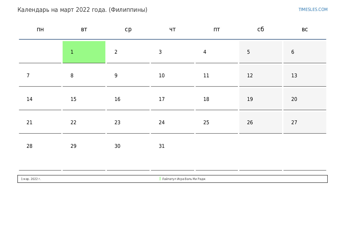 Скачать и распечатать PDF календарь с праздниками и выходными днями на март 2022 года для Филиппин