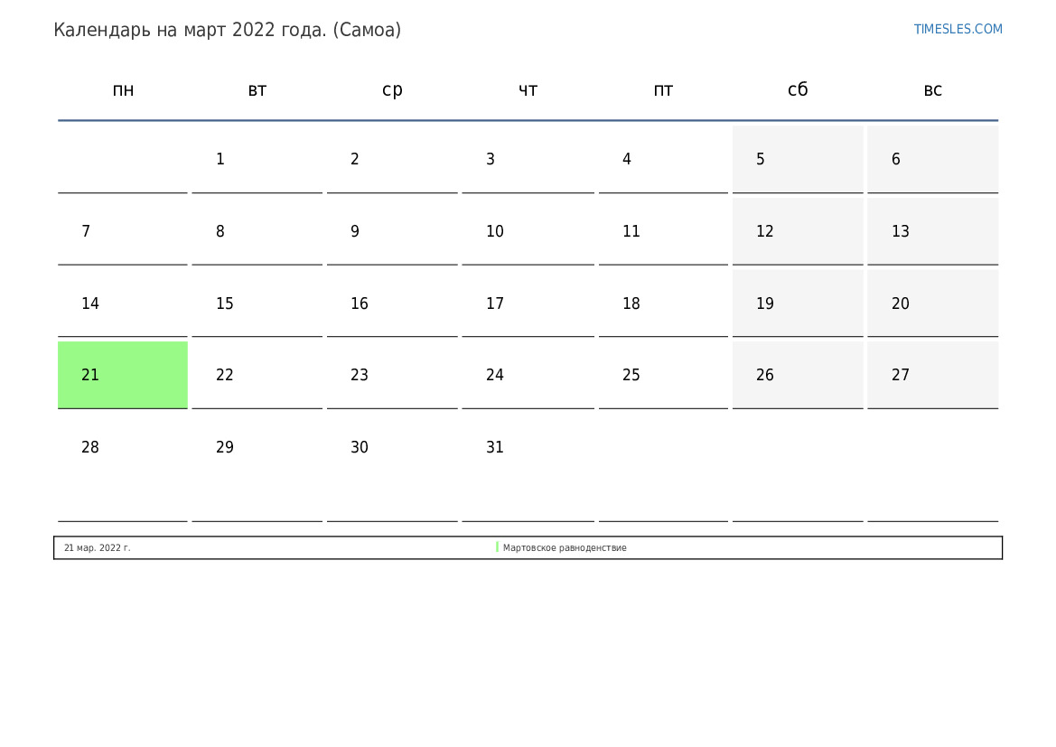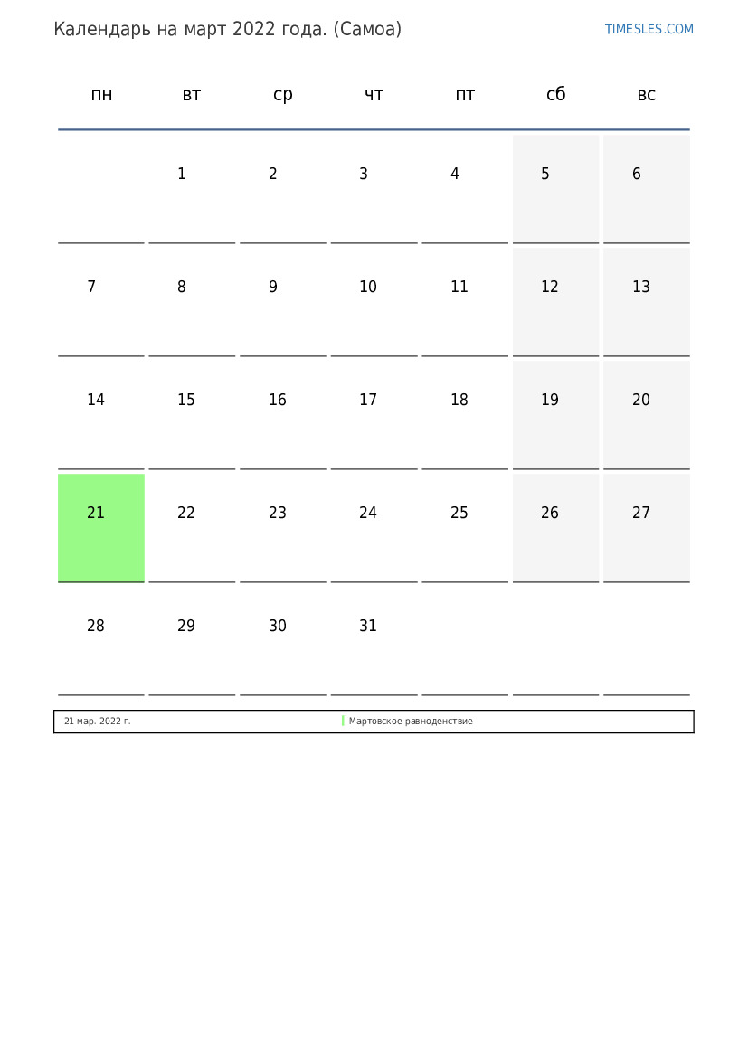 Скачать и распечатать PDF календарь с праздниками и выходными днями на март 2022 года для Самоа