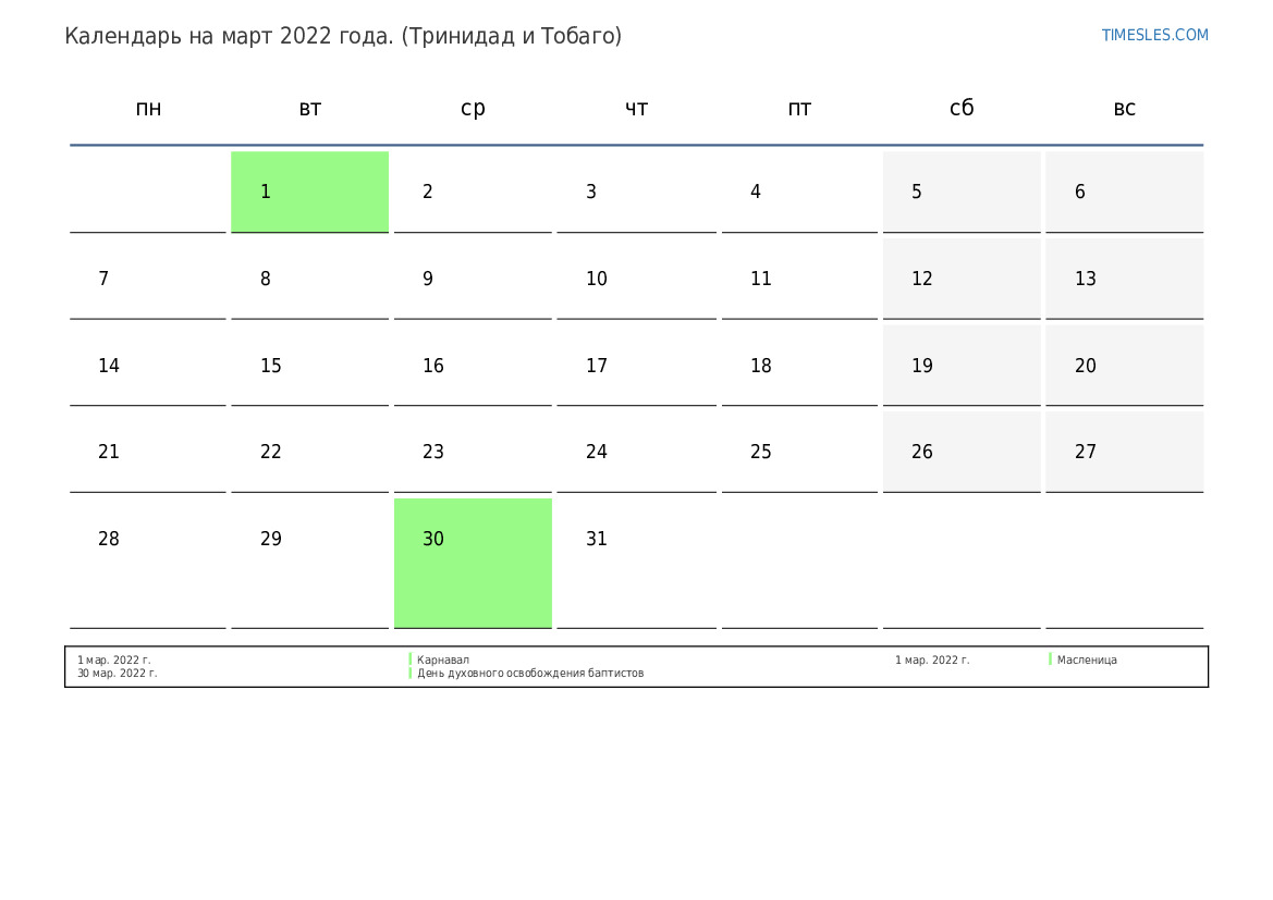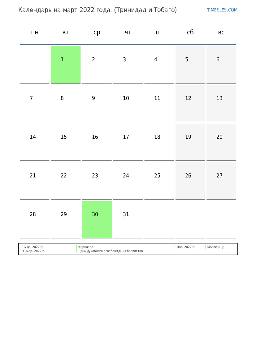 Месяц март содержит 31 день. Это 3 месяц 2022 года. Сезон года: весна. Месяц март начинается во вторник, и заканчивается в четверг. В месяц март 2022 года в Тринидаде и Тобаго 4 праздничных и выходных дня.