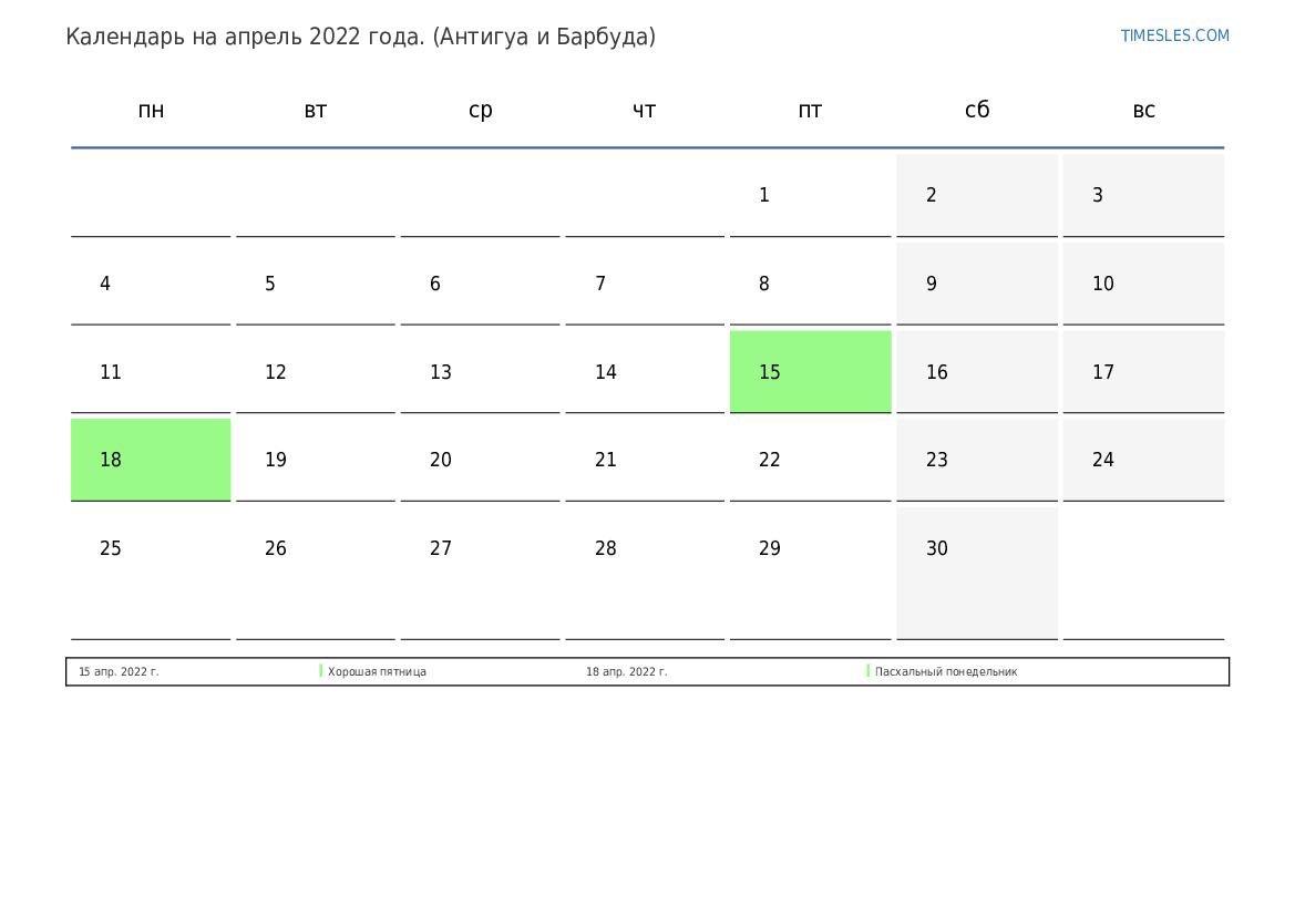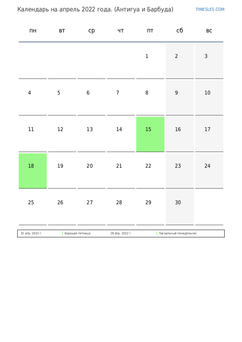 Календарь на апрель 2022 года для Антигуа и Барбуды