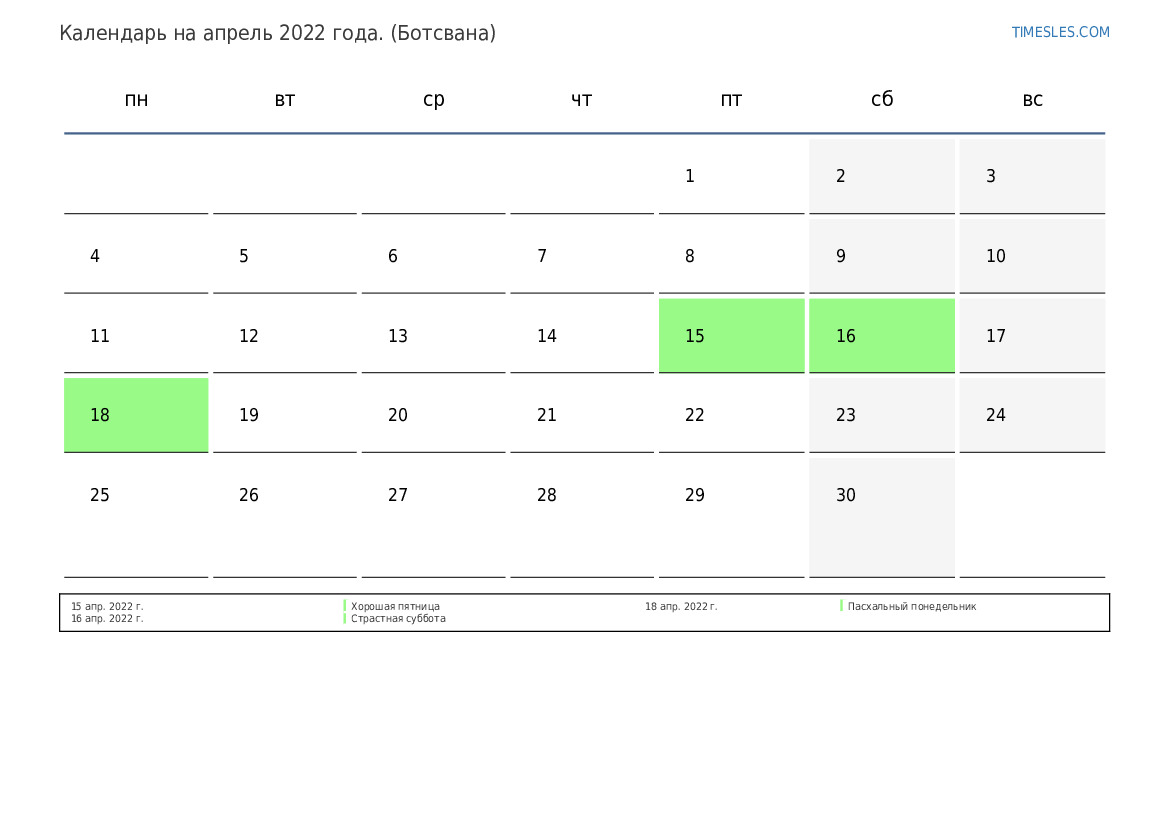Календарь праздников и выходных дней на апрель 2022 года для Ботсваны