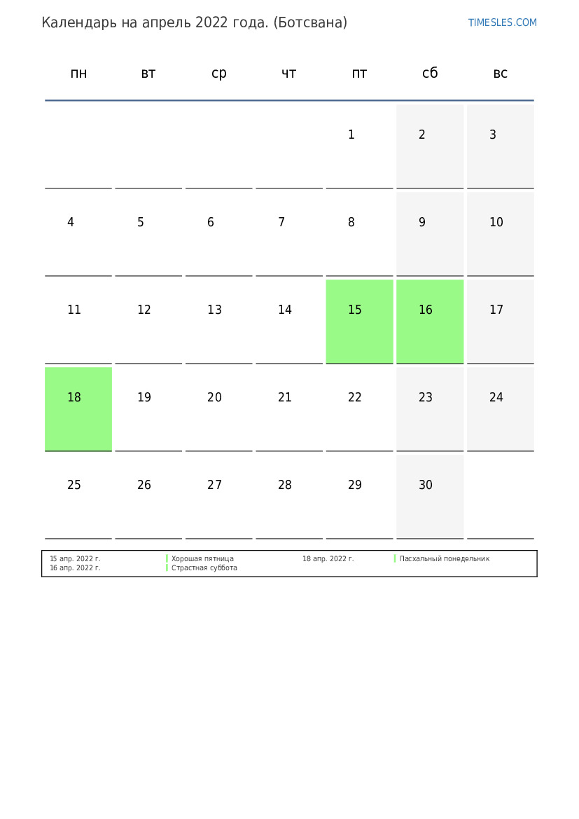 Скачать и распечатать PDF календарь с праздниками и выходными днями на апрель 2022 года для Ботсваны
