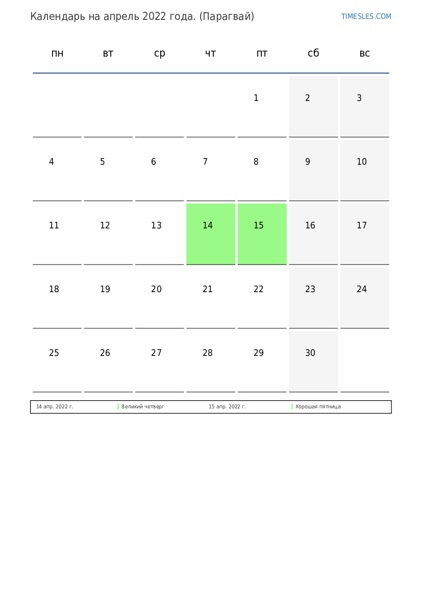 Месяц апрель содержит 30 дней. Это 4 месяц 2022 года. Сезон года: весна. Месяц апрель начинается в пятницу, и заканчивается в субботу. В месяц апрель 2022 года в Парагвае 2 праздничных и выходных дня.