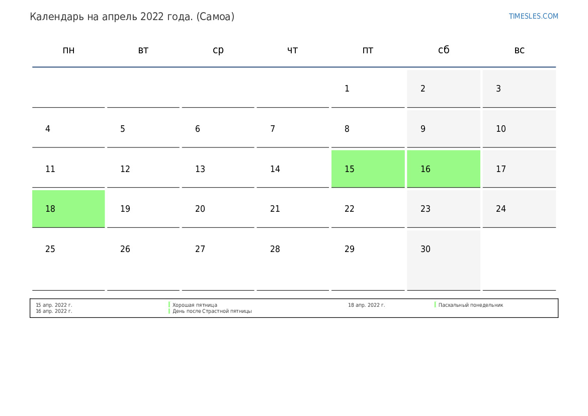Календарь праздников и выходных дней на апрель 2022 года для Самоа