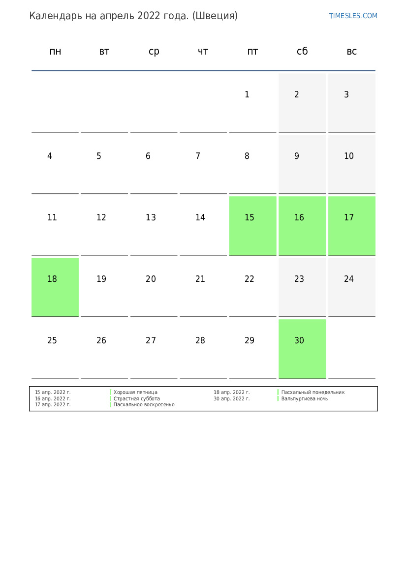 Календарь праздников и выходных дней на апрель 2022 года для Швеции