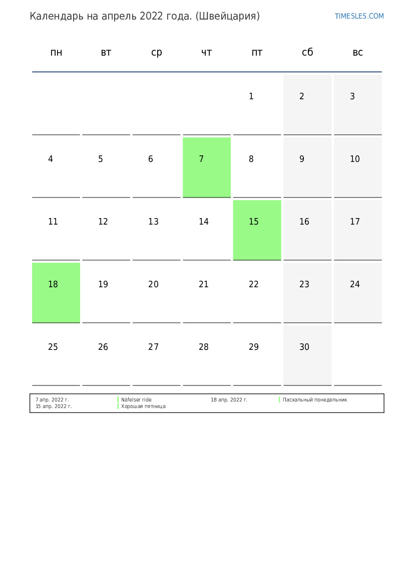 Календарь праздников и выходных дней на апрель 2022 года для Швейцарии