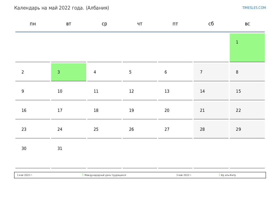 Календарь праздников и выходных дней на май 2022 года для Албании