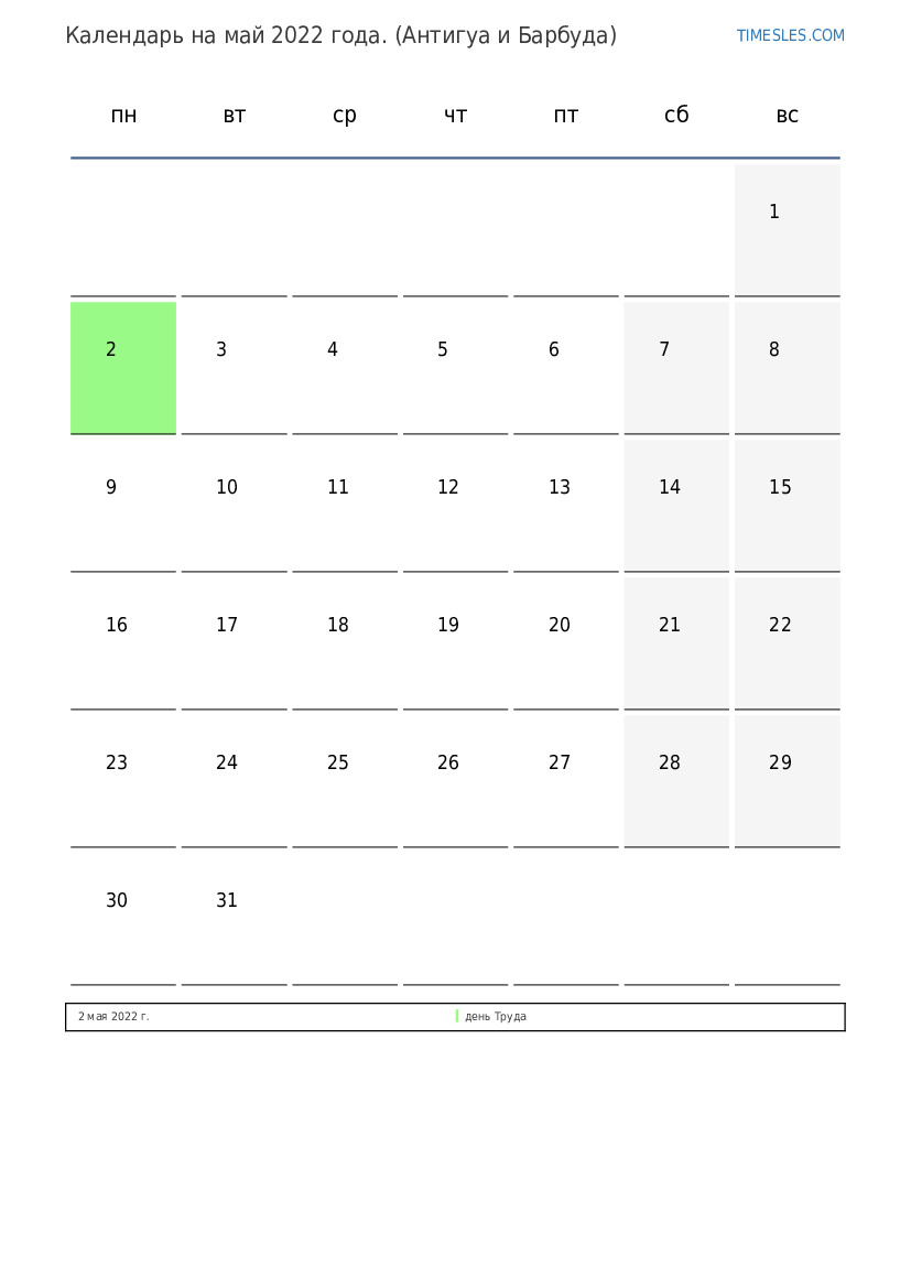Календарь праздников и выходных дней на май 2022 года для Антигуа и Барбуды