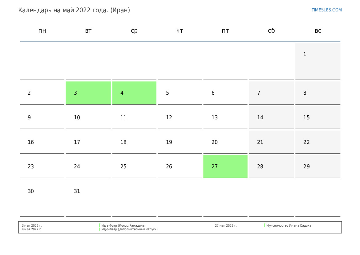 Календарь праздников и выходных дней на май 2022 года для Ирана