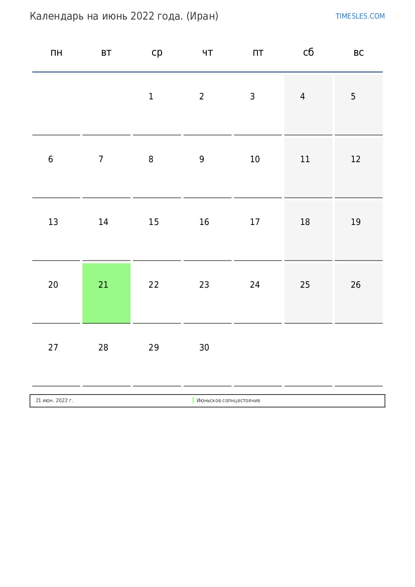 Месяц июнь содержит 30 дней. Это 6 месяц 2022 года. Сезон года: лето. Месяц июнь начинается в среду, и заканчивается в четверг. В месяц июнь 2022 года в Иране 1 праздничный и выходной день.