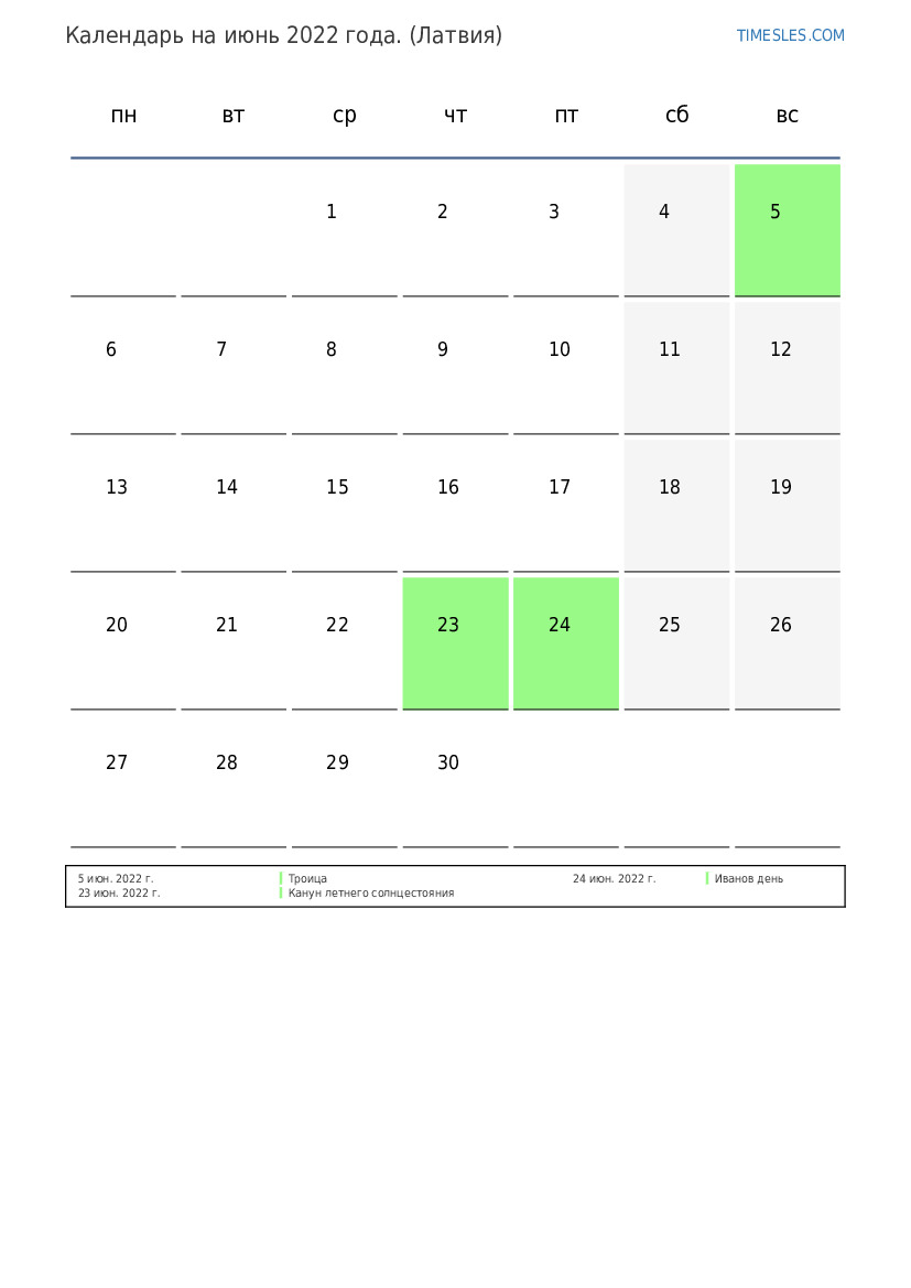 Календарь праздников и выходных дней на июнь 2022 года для Латвии