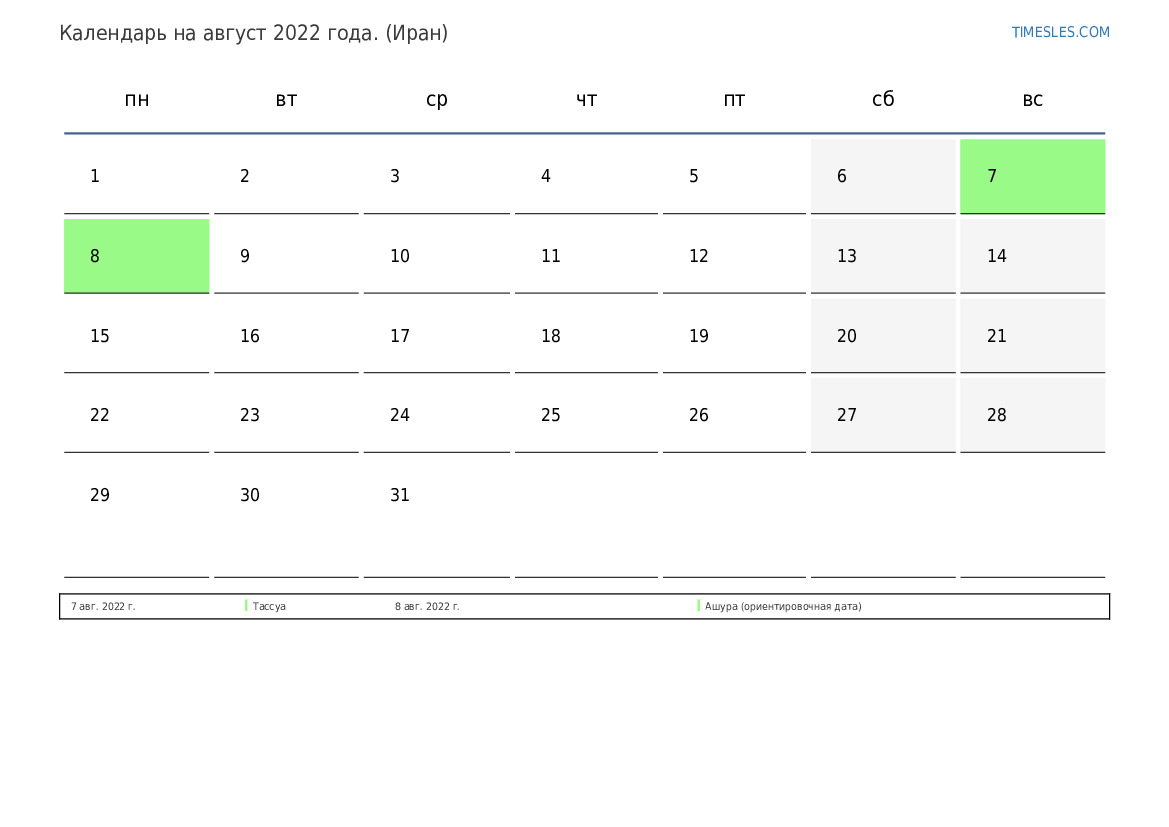 Календарь праздников и выходных дней на август 2022 года для Ирана