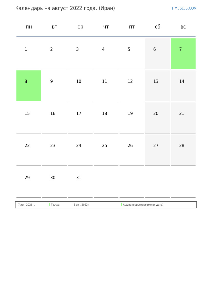 Скачать и распечатать PDF календарь с праздниками и выходными днями на август 2022 года для Ирана
