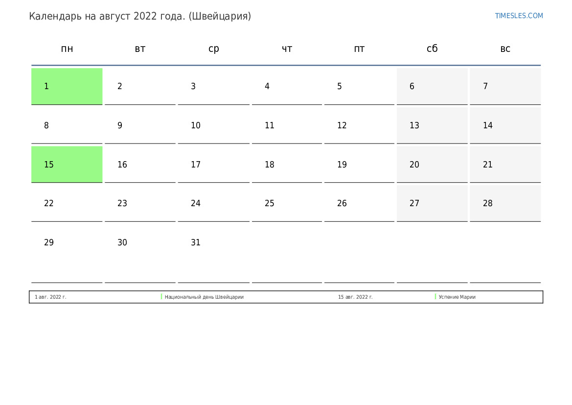 Календарь праздников и выходных дней на август 2022 года для Швейцарии