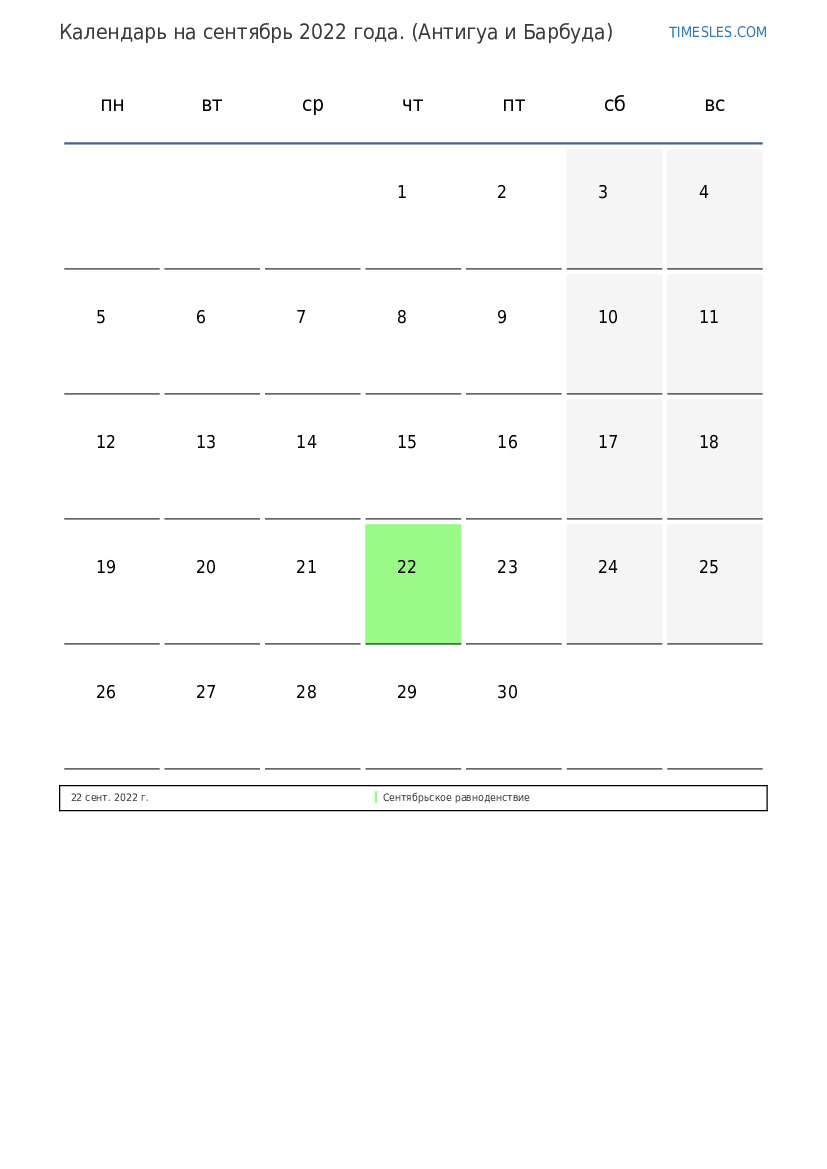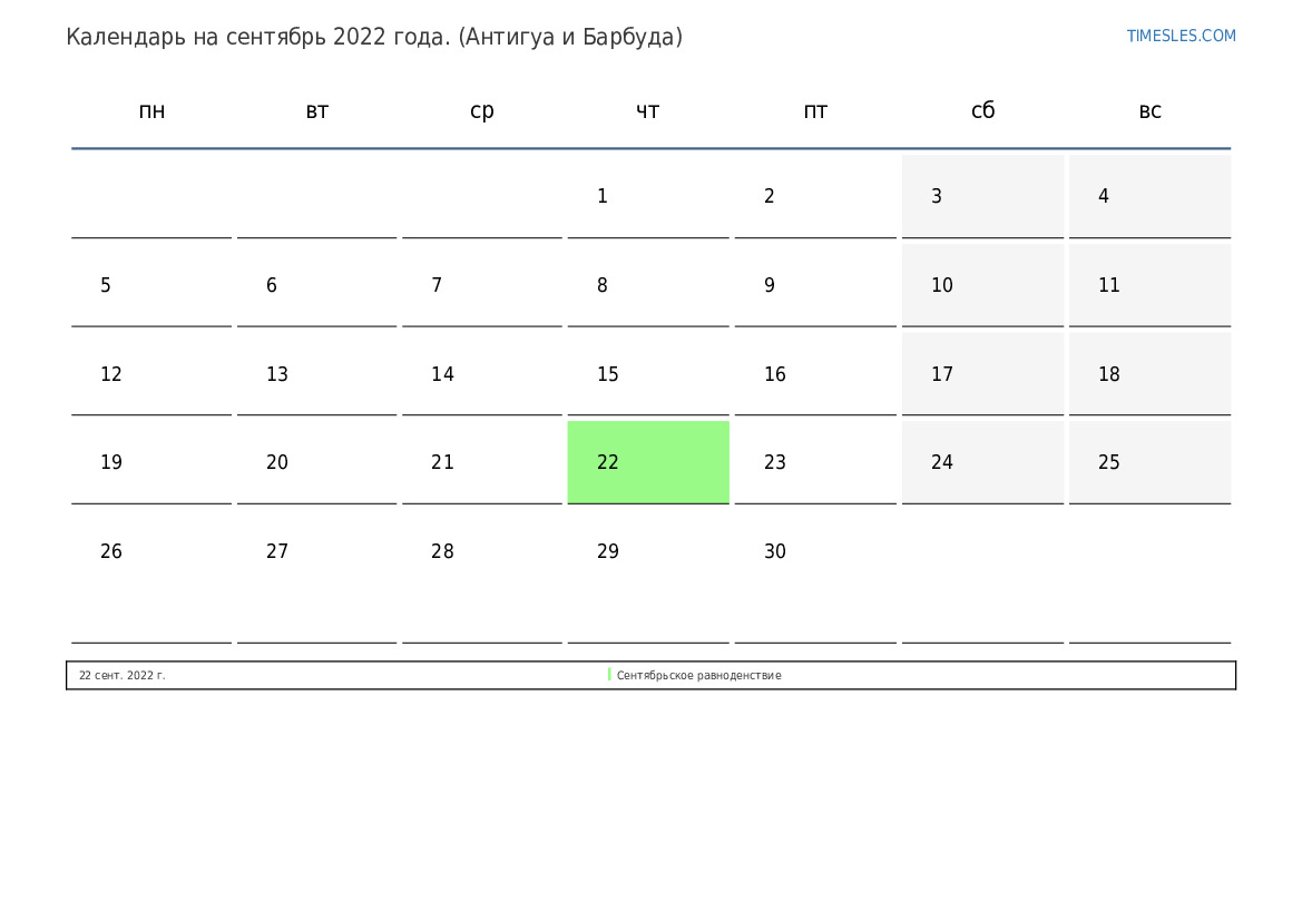 Календарь на сентябрь 2022 года для Антигуа и Барбуды