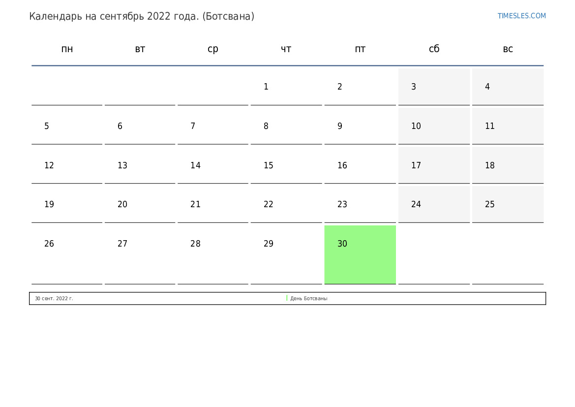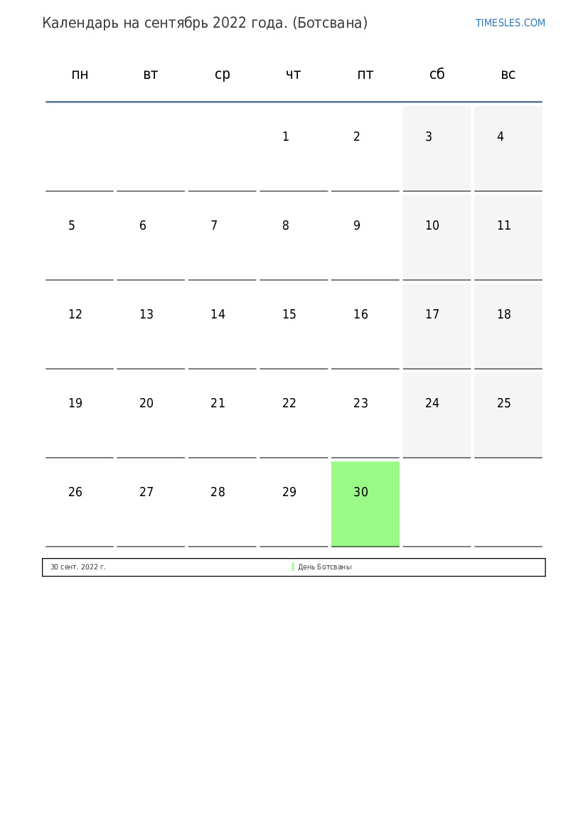 Скачать и распечатать PDF календарь с праздниками и выходными днями на сентябрь 2022 года для Ботсваны
