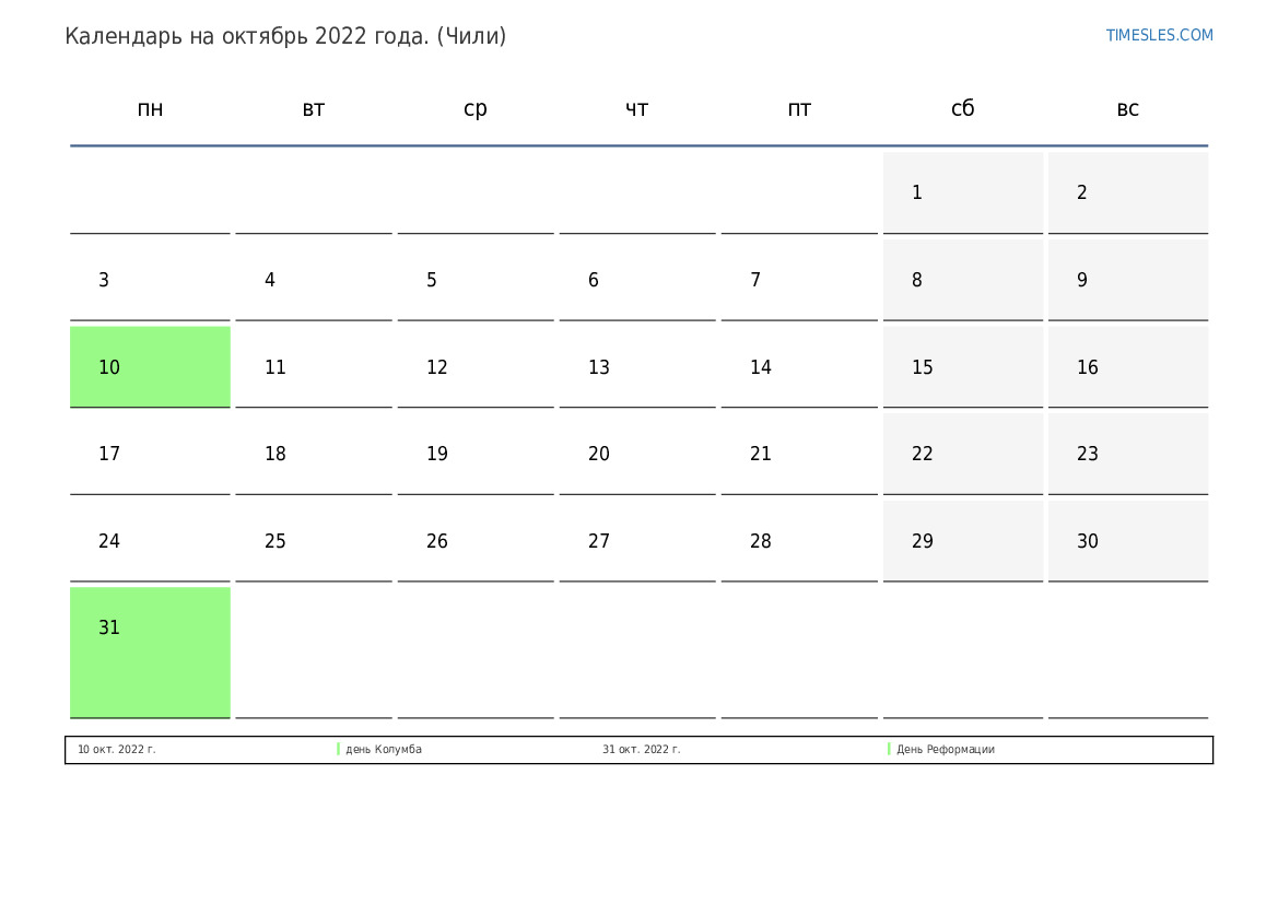 Календарь праздников и выходных дней на октябрь 2022 года для Чили