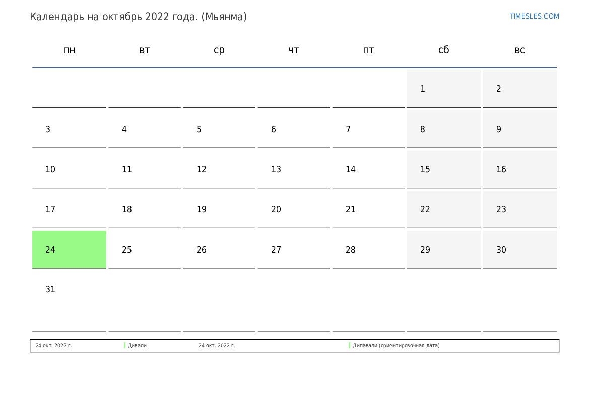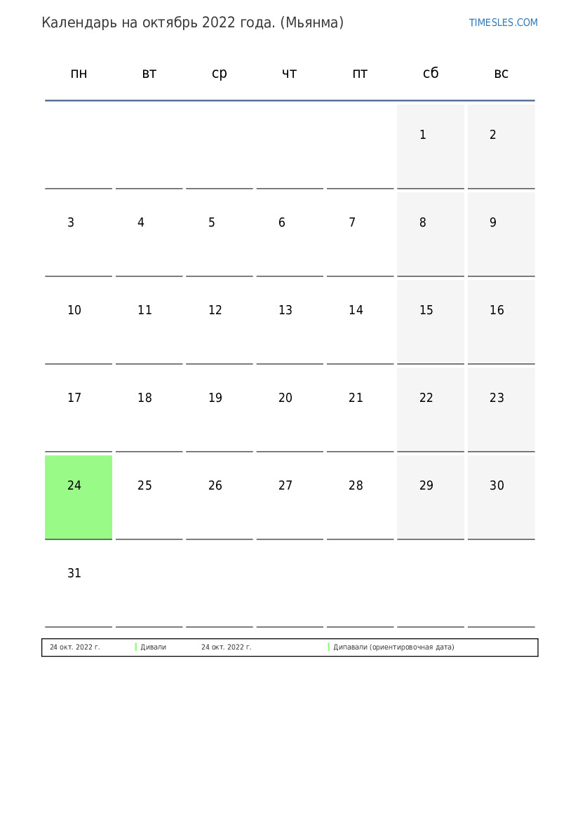 Календарь на октябрь 2022 года для Мьянмы
