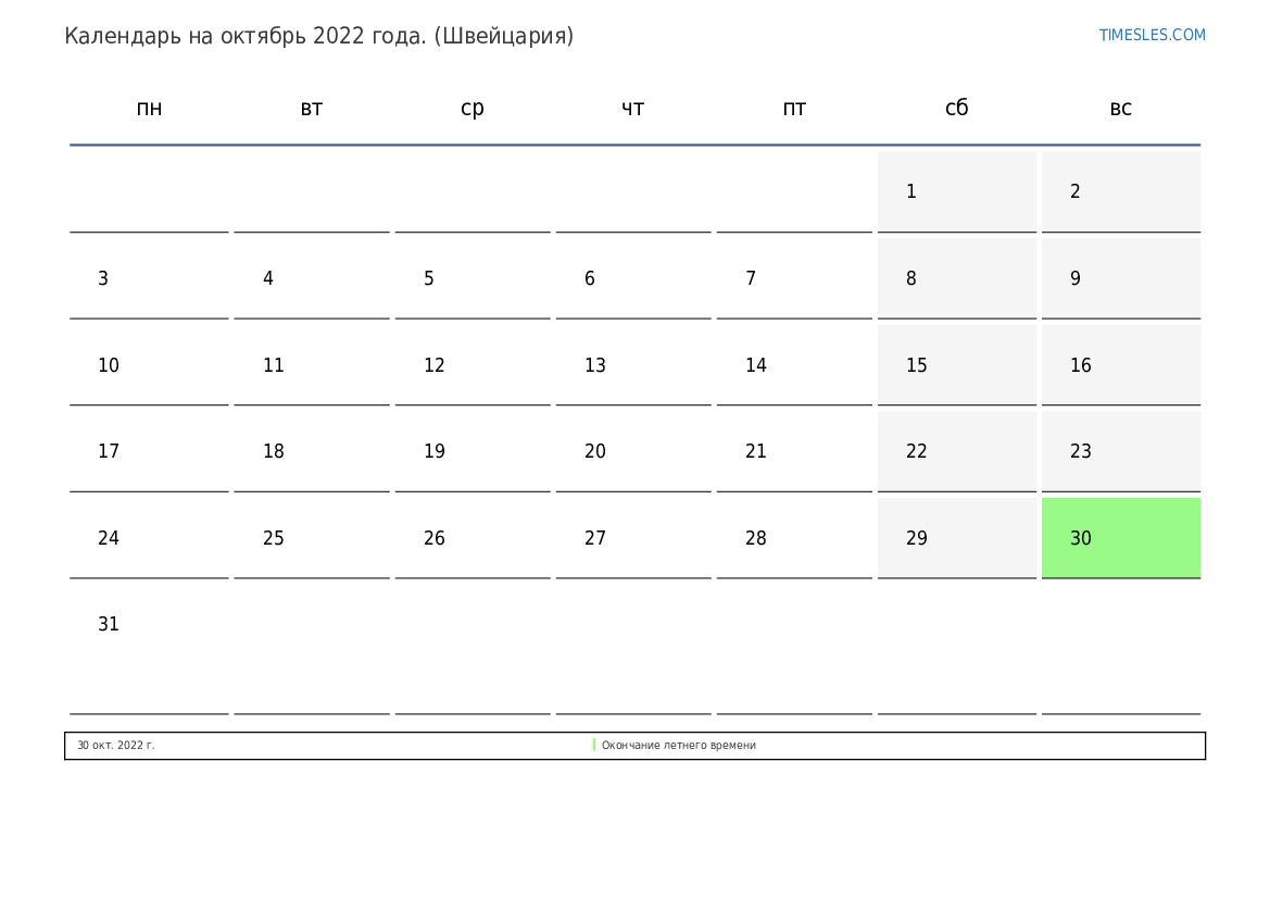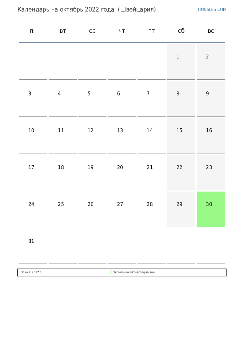Скачать и распечатать PDF календарь с праздниками и выходными днями на октябрь 2022 года для Швейцарии