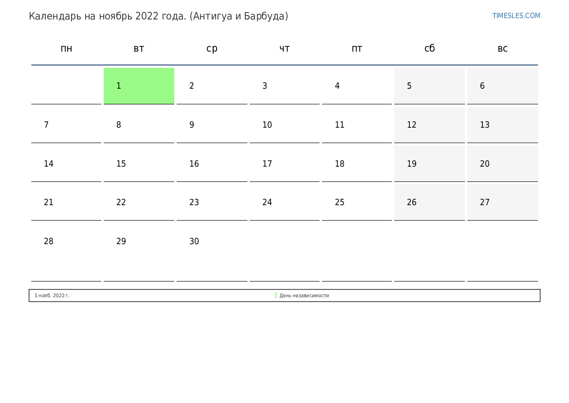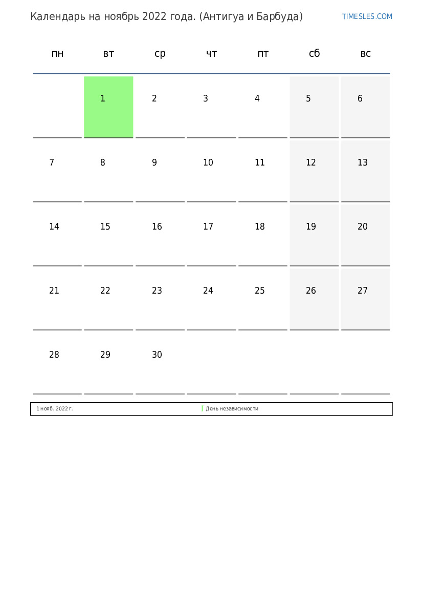 Календарь на ноябрь 2022 года для Антигуа и Барбуды
