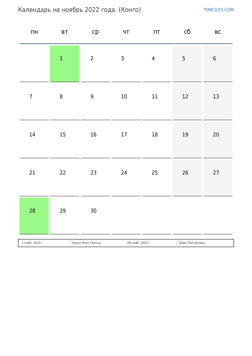 Скачать и распечатать PDF календарь с праздниками и выходными днями на ноябрь 2022 года для Конго
