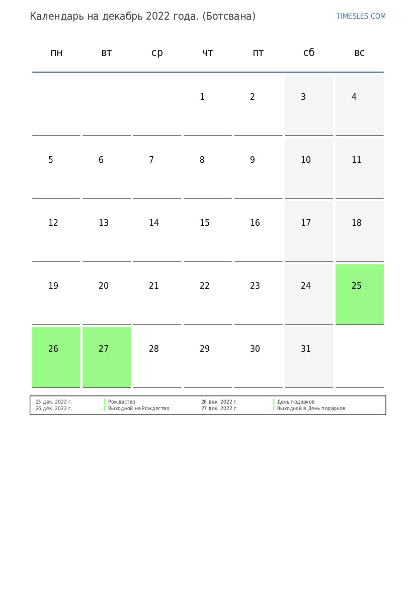 Скачать и распечатать PDF календарь с праздниками и выходными днями на декабрь 2022 года для Ботсваны
