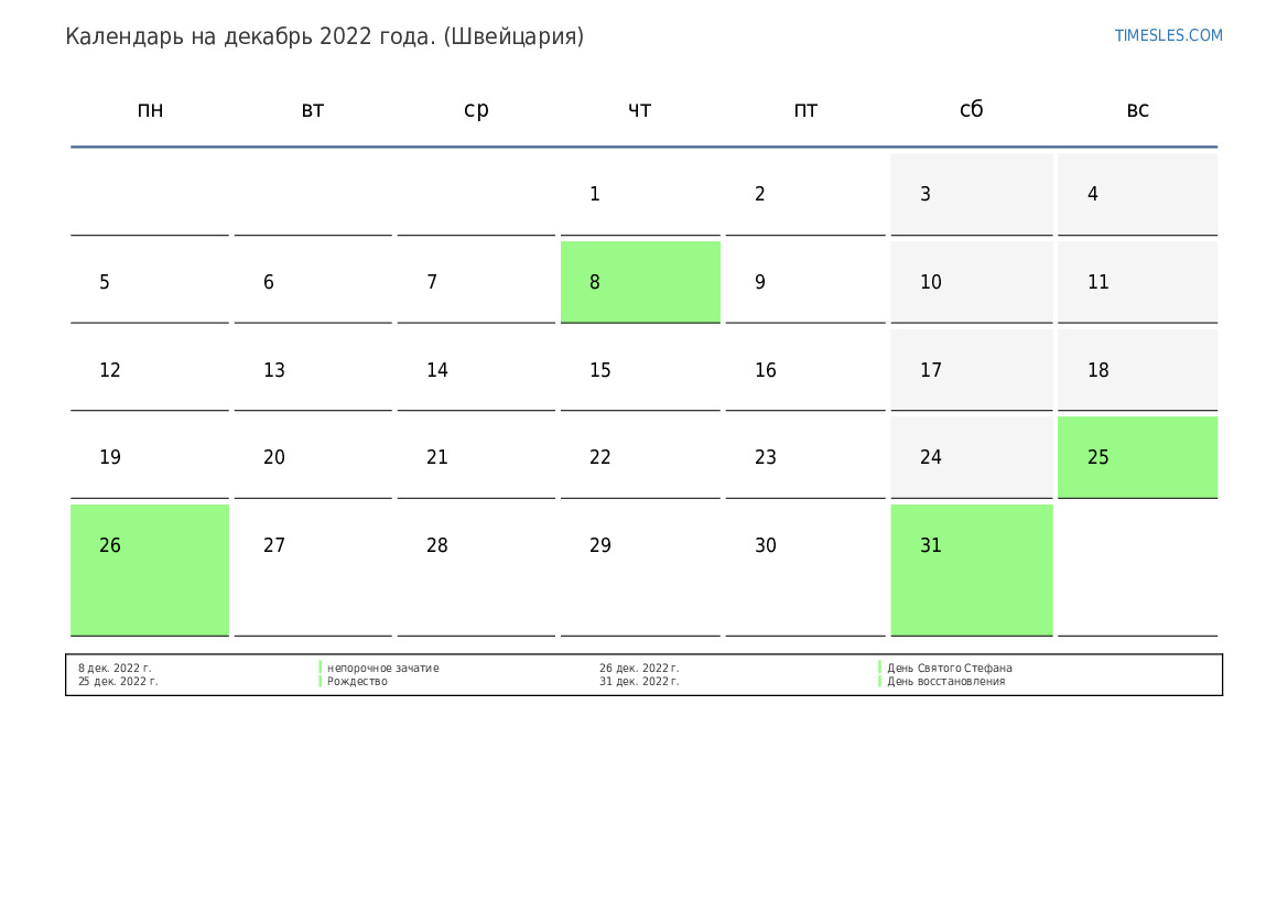 Календарь праздников и выходных дней на декабрь 2022 года для Швейцарии