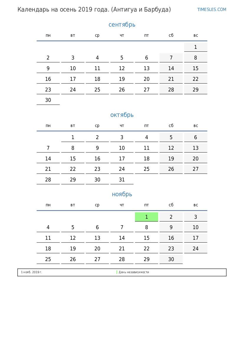Календарь на осень 2019 года для Антигуа и Барбуды