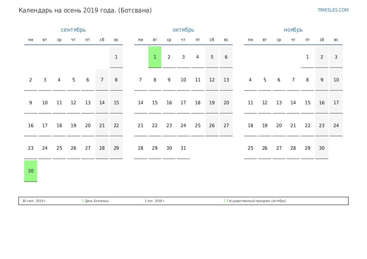 Скачать и распечатать PDF календарь с праздниками и выходными на осень 2019 года для Ботсваны