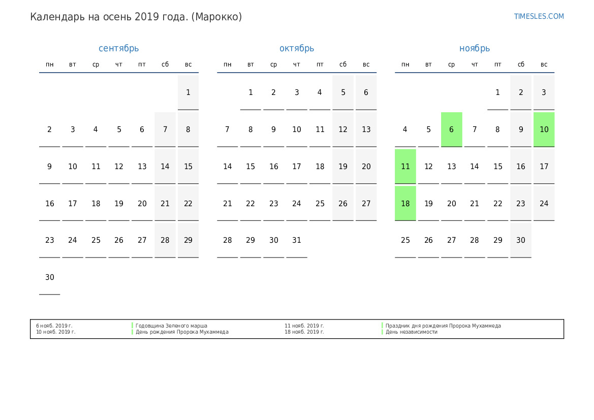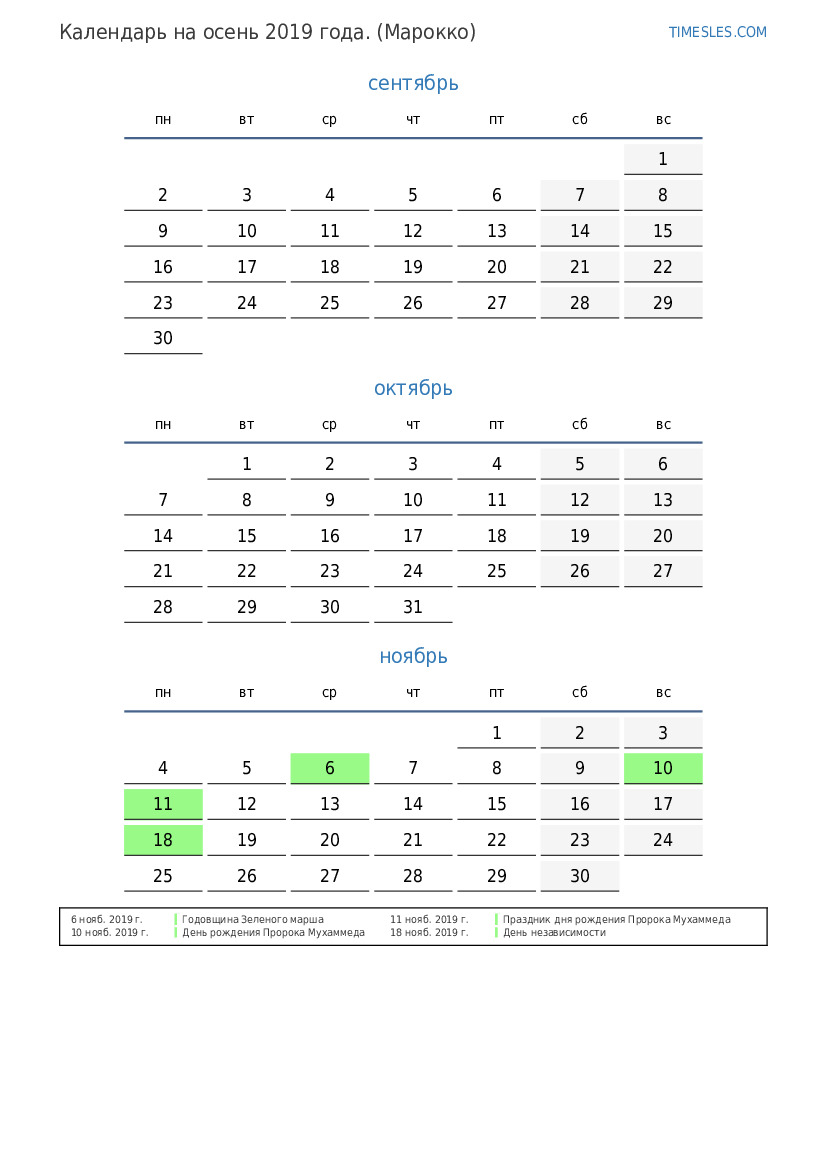 Скачать и распечатать PDF календарь с праздниками и выходными на осень 2019 года для Марокко