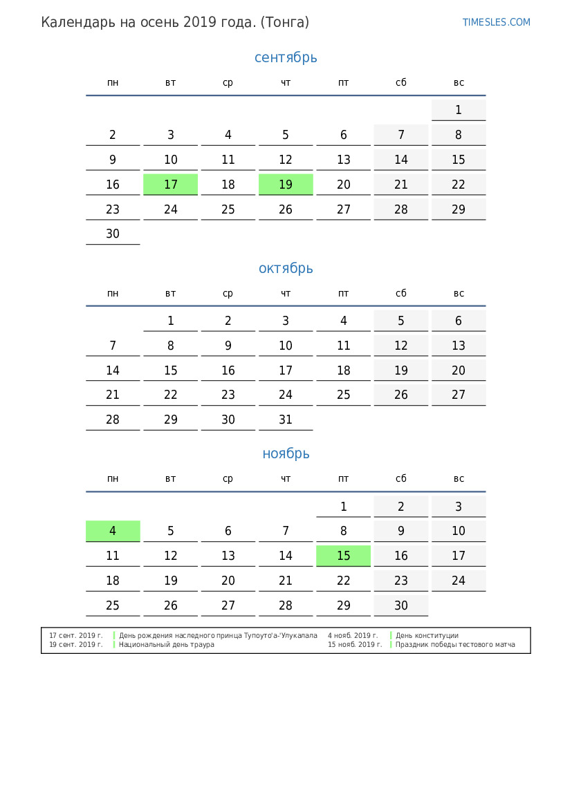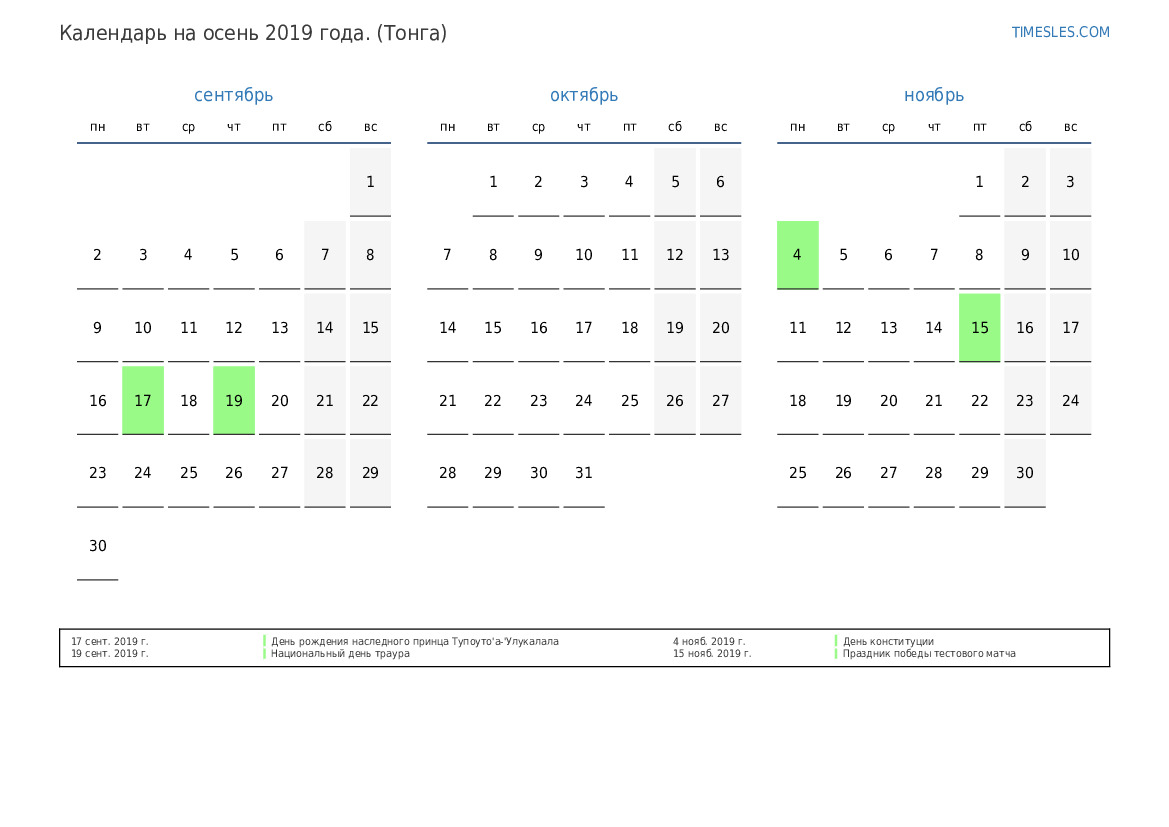 Скачать и распечатать PDF календарь с праздниками и выходными на осень 2019 года для Тонги