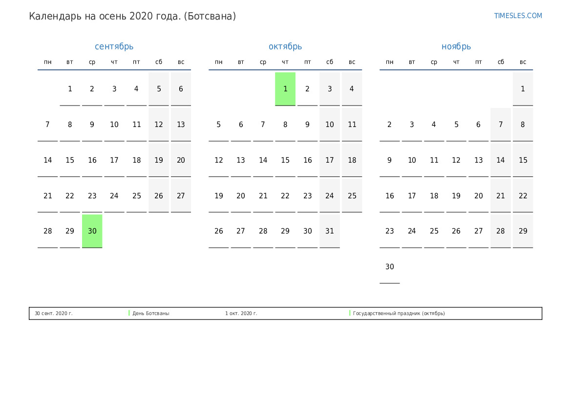 Календарь на осень 2020 года для Ботсваны